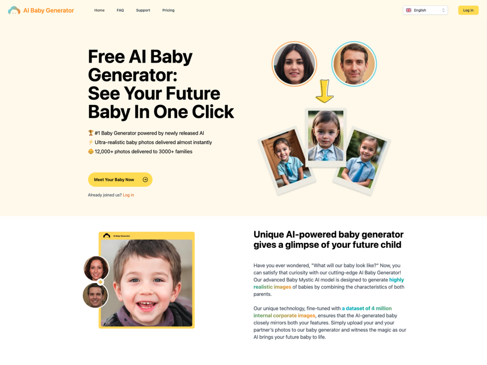 See your own future baby using our free AI baby face generator. Receive ultra-realistic baby photos prediction only in seconds, with one click!