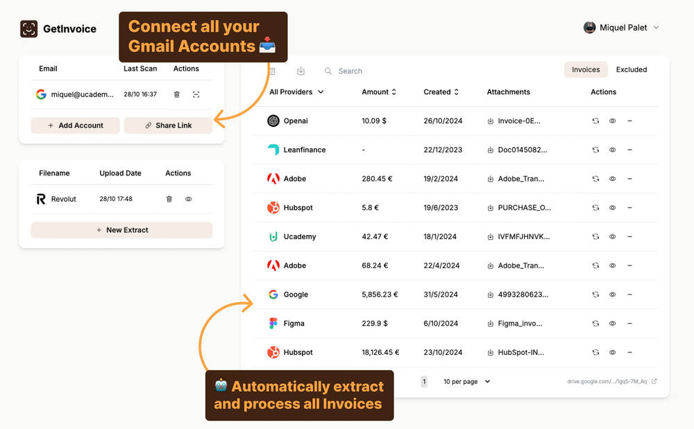 GetInvoice automatically collects and processes invoices from your emails and web portals