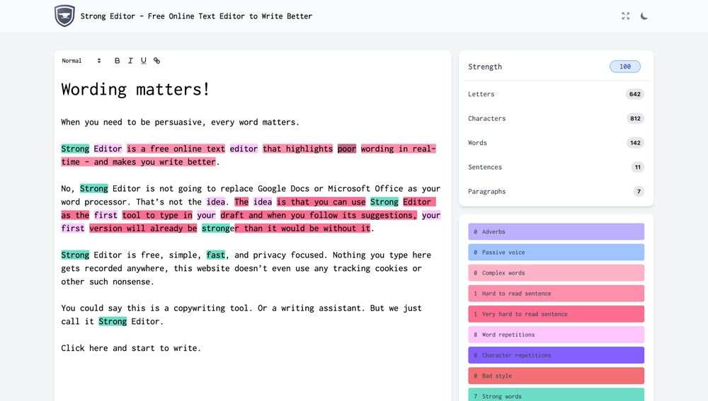 Strong Editor is a free online text editor designed to improve writing quality by identifying and highlighting poor wording in real-time. It serves as a first-draft tool to strengthen initial writing before transferring to full-fledged word processors.