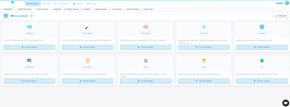 platform offers a suite of marketing products that you can use to grow your company, find leads, send emails, create a chatbot.