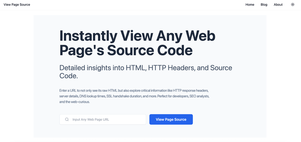 View Page Source is a web-based tool designed to help users instantly access and analyze the source code of any webpage. It provides a user-friendly interface for viewing raw HTML, HTTP response headers, and other critical web information.